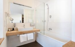 L'hotel è accogliente, le varie aree comuni sono ben arredate. I tavoli e i posti a sedere sono disposti in modo irregolare e quasi ovunque si ha una vista sull'esterno. La posizione è adatta a un'ampia gamma di attività. Molti vengono a sciare. Ayurveda e sci è una combinazione particolarmente interessante. Il direttore dell'hotel fornisce personalmente consigli per escursioni e attività. L'hotel è perfetto come punto di partenza per escursioni a piedi e in bicicletta. La pista ciclabile inizia praticamente dal parcheggio di fronte all'hotel. Naturalmente è possibile parcheggiare l'auto proprio davanti all'hotel. Le camere sono accoglienti, con vista sulle montagne. Solo i materassi erano un po' logori, ma dovrebbero essere in arrivo nuovi materassi. Avrei preferito un gel doccia diverso nel bagno. Il gel doccia blu potrebbe andare bene per gli sportivi invernali, ma per un'accogliente sensazione ayurvedica, troverei anche un gel doccia/shampoo con un colore più naturale e un profumo erbaceo o forse anche qualcosa di ayurvedico?
